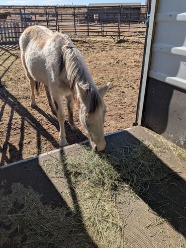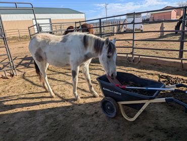 About 5 days after her arrival, Luna manifested a snotty nose. Ten days of antibiotics did not clear it. And, in about 3 weeks it resolved. In my experience, antibiotics disrupt the natural flora absolutely necessary for equine digestion. Luna has rub "spots" in a couple of places. Dewormer was utilized to address. As the rub "spots" continue, gut health was considered. Luna is receiving probiotic, fiber, soaked alfalfa/grass cubes and omega 3. She is eating straight grass hay and drinks plenty of fresh water.