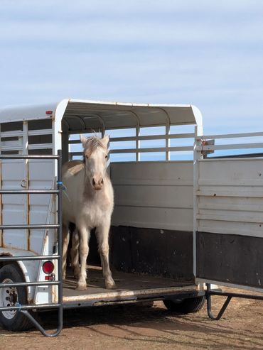Luna has achieved so much since coming to Steadfast Steeds in November 2025. From the beginning she has presented as curious, smart and friendly. She also has not been so accepting of touch with a hand. Rubrics to be met have taken more time than anticipated, and, she has come SO FAR since the day she arrived. Following are the "things" she participates in willingly: meets two-leggeds at the gate, whinnies at feeding time, stables well alone or with other horses, makes friends with other horses easily, drinks from a bucket, rubber tub and large water trough, can eat from a bucket, rubber tub (netted hay), follows willingly, can be sorted easily, moves through gates, and self-loads into the trailer.